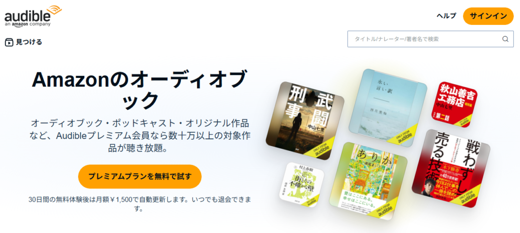 audiobook.com40万冊以上約1,500円30日★★★☆☆